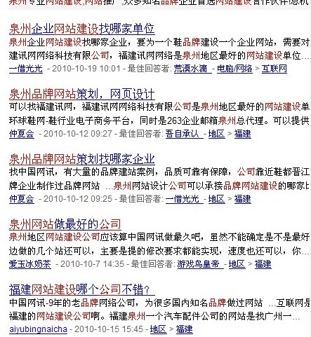 在百度搜索中,我們通過輸入“泉州品牌/企業網站建設”,可以直觀的看到顯示的以下信息: